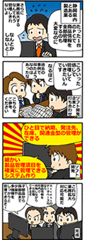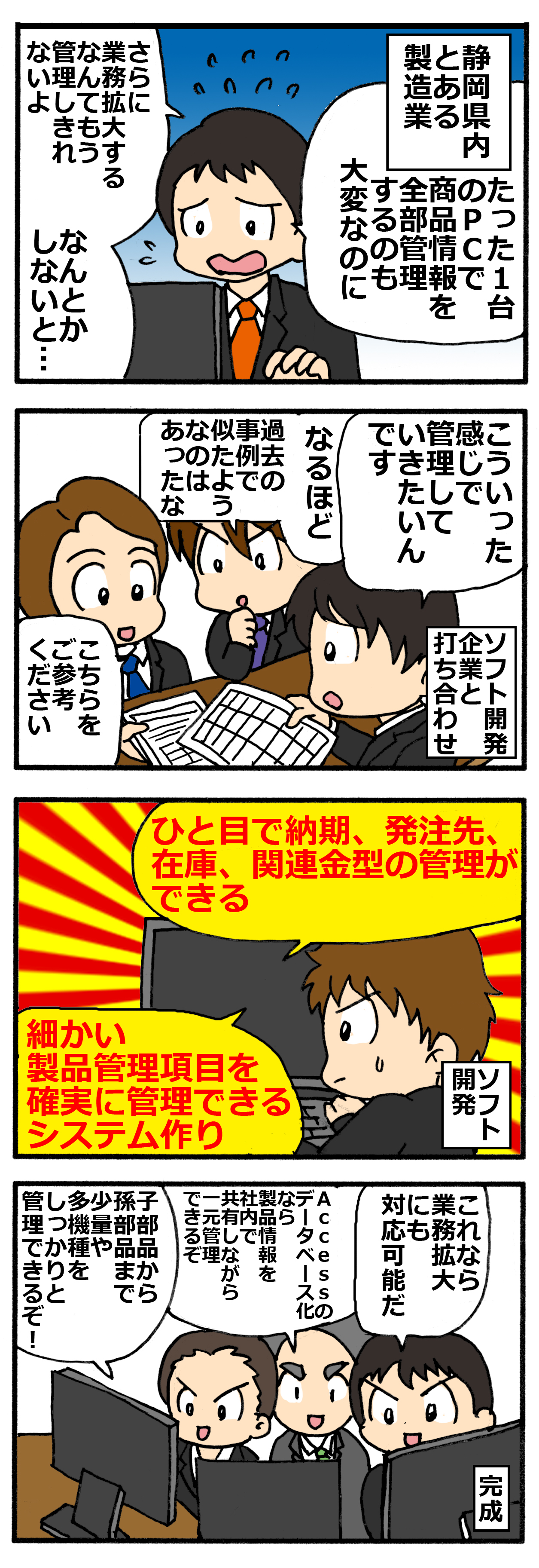 Excelを使いパソコン1台で管理していた情報を、業務拡大に伴いAccessでのパソコン10台程のネットワークシステムによる管理が出来るようになりました。 ( ↓ 4コマ漫画 クリックで拡大します)
