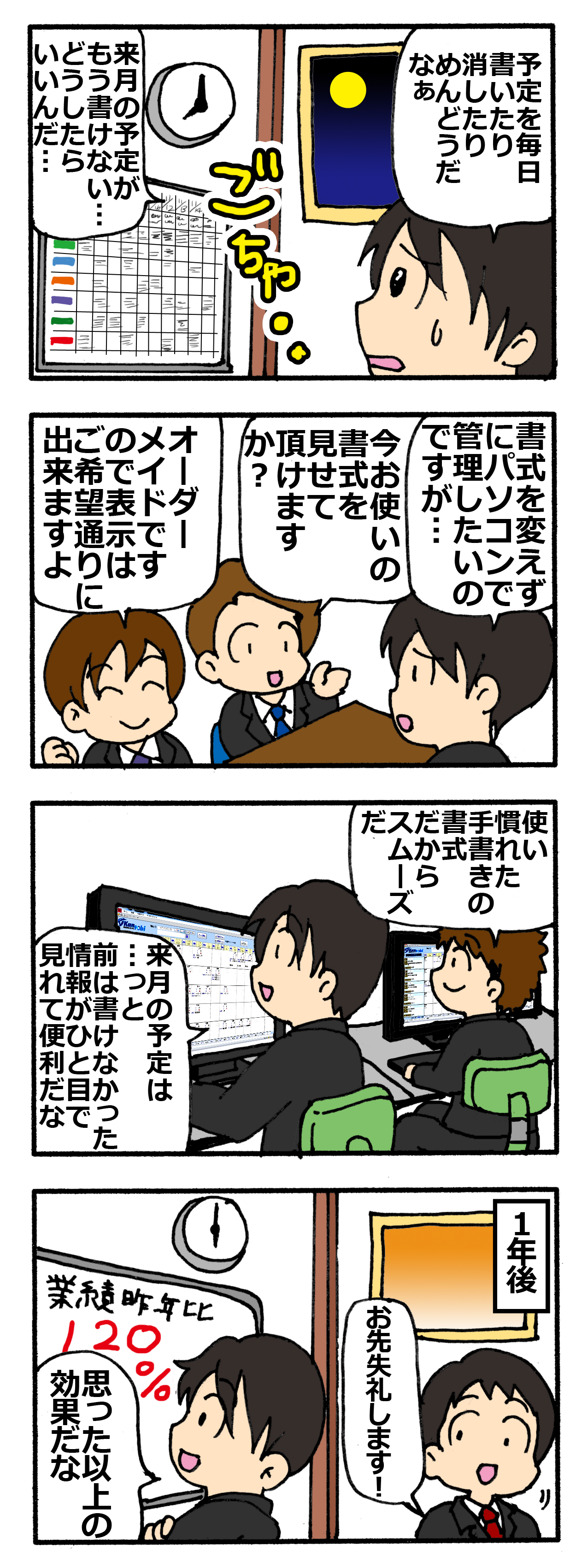 予定などの社内情報を手書きで管理しており、先の予定の管理が難しかったが、書式はそのままでシステム化することにより使用感を損ねずに予定の管理ができるようになりました。 ( ↓ 4コマ漫画 クリックで拡大します)